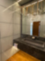 The Powder Bath was created with a modern twist on an underwater concept, featuring the client's 3D boat art which hung over a floating vanity, waterfall faucet, tiled walls, and specialty lighting.